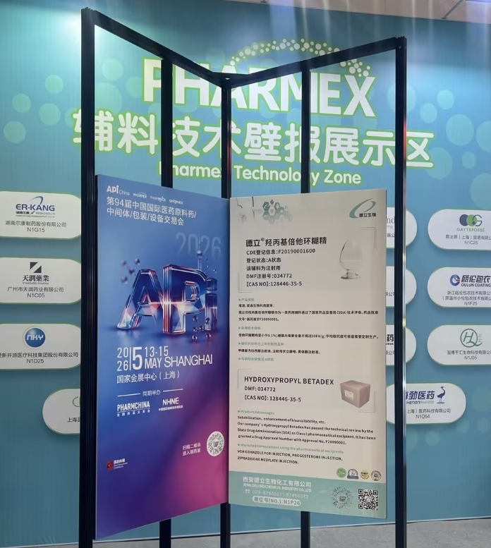 Xi'an Deli Biochemical Industry Co., Ltd. 2025 API చైనా ఎగ్జిబిషన్లో చాంగ్కింగ్లో పాల్గొంది, కంపెనీ ఫ్లాగ్షిప్ ఉత్పత్తులను ప్రదర్శిస్తుంది-హైడ్రాక్సీప్రోపైల్ బీటాడెక్స్ (HPBCD)మరియుబీటాడెక్స్ సల్ఫోబ్యూటిల్ ఈథర్ సోడియం (SBECD)- ప్రపంచ ఔషధ మరియు రసాయన పరిశ్రమ నిపుణులకు.
