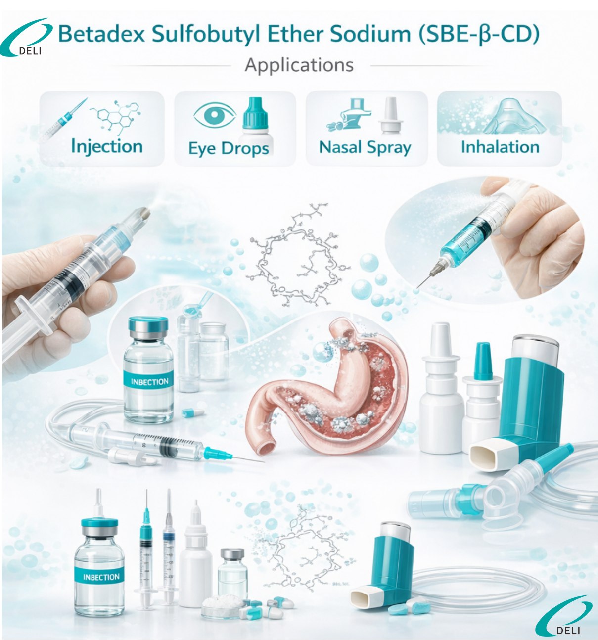 ఇంజెక్షన్ గ్రేడ్ Betadex Sulfobutyl ఈథర్ సోడియం ప్రధానంగా నాన్-ఓరల్ ఫార్మాస్యూటికల్ డోసేజ్ ఫారమ్లలో వర్తించబడుతుంది, ఇక్కడ అధిక ద్రావణీయత మరియు భద్రత కీలకం. ఇది సజల ద్రావణీయతను మెరుగుపరచడానికి మరియు నిల్వ మరియు పరిపాలన సమయంలో సూత్రీకరణ స్పష్టత మరియు స్థిరత్వాన్ని నిర్వహించడానికి ఇంజెక్షన్ పరిష్కారాలలో విస్తృతంగా ఉపయోగించబడుతుంది.